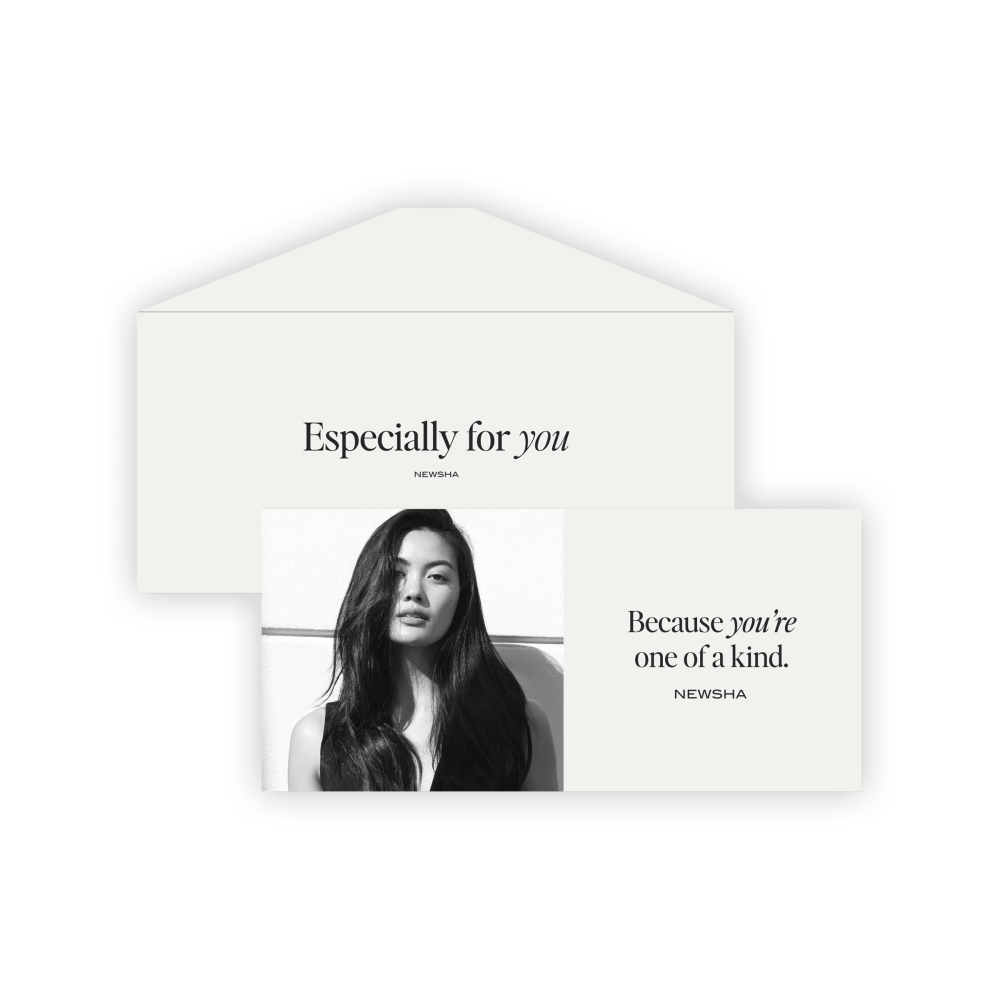 Der Gutschein kann direkt eingelöst werden und gewährt Zugang zu den exklusiven NEWSHA-Produkten für ein individuelles, verwöhnendes Haircare-Erlebnis. Der hochwertige Umschlag sorgt für eine stilvolle Präsentation und macht das Schenken zu einem Moment voller Eleganz.