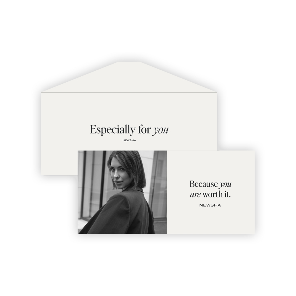 Der Gutschein kann direkt eingelöst werden und gewährt Zugang zu den exklusiven NEWSHA-Produkten für ein individuelles, verwöhnendes Haircare-Erlebnis. Der hochwertige Umschlag sorgt für eine stilvolle Präsentation und macht das Schenken zu einem Moment voller Eleganz.